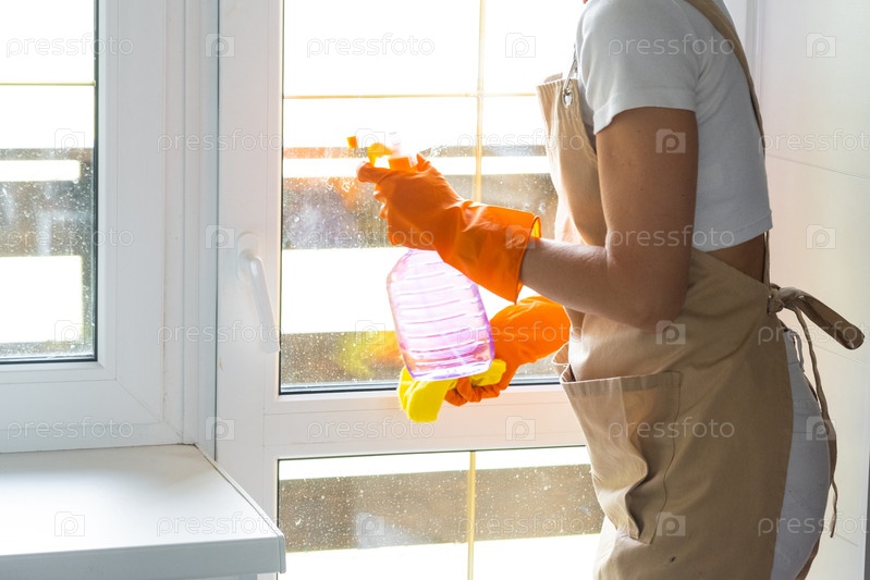 Женщина в резиновых перчатках и фартуке вручную моет оконный балкон дома тряпкой и шваброй внутри интерьера. Восстановление порядка и чистоты весной, уборка сервиза