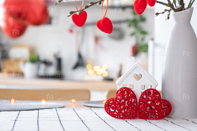 Ключ к крошечному дому уютного дома с декором Валентина на столе кухни. Подарок на день валентинок, семейное гнездо любви. дизайн, проект, переезд в новый дом, ипотека, аренда и покупка недвижимости