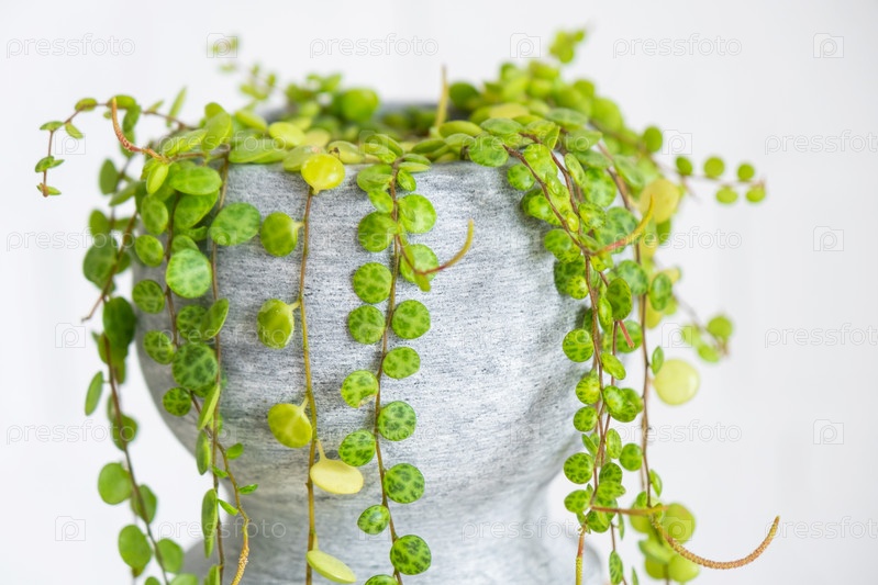 Длинные ресницы пеперомия свисают в бетонном горшке с круглыми черепаховыми листьями. Пеперомия крупным планом в интерьере на белом фоне, декоративное растение