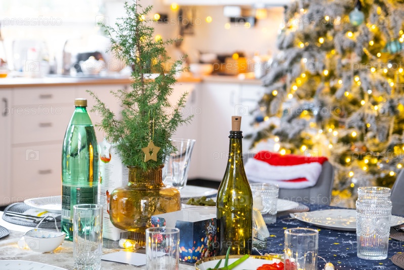 Праздничный стол, установленный для гостей на Рождество и Новый год, рождественская елка в гостиной, тарелки, бутылки, стаканы, горшечные растения, сказочные огни