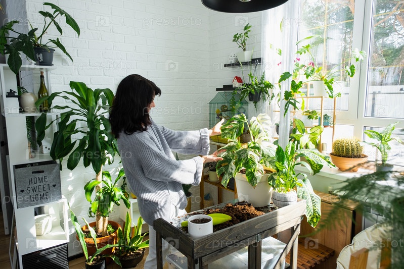 Женщина держит дома растение редкого варегатного монстра Альба в горшке в домашнем интерьере