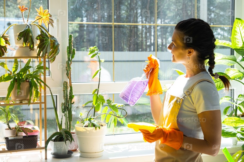 Женщина Портрет в резиновых перчатках и фартуке вручную моет окно дома тряпкой и шваброй внутри интерьера с домашними растениями. Восстановление порядка и чистоты весной, уборка сервиза