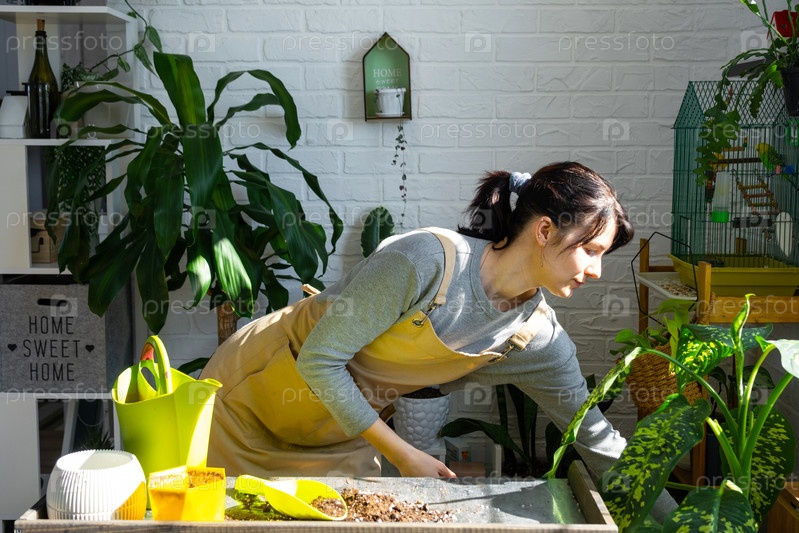 Пересадка и уход за домашним растением dieffenbachia Cheetah в новый горшок в домашнем интерьере. Женщина разводит и выращивает растения как хобби, держит вариетальную диффенбахию с большими пятнистыми листьями, больших размеров