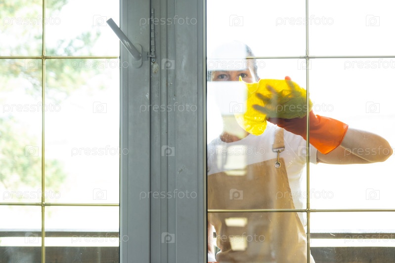 Женщина в резиновых перчатках и фартуке вручную моет оконный балкон дома тряпкой и шваброй снаружи за стеклом. Восстановление порядка и чистоты весной, уборка сервиза