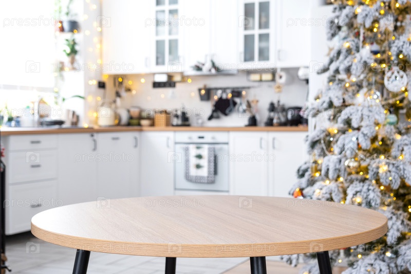 Круглый пустой стол, чтобы продемонстрировать продукт с пространством для текста на белой кухне, современный интерьер с елкой и сказочными огнями. Новый год, рождественское настроение, уютный дом