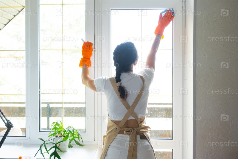 Женщина в резиновых перчатках и фартуке вручную моет оконный балкон дома тряпкой и шваброй внутри интерьера. Восстановление порядка и чистоты весной, уборка сервиза