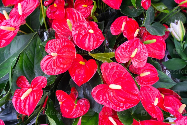 Цветы красного антурия в цветочном магазине - узор цветущих сердец мужского счастья, оптовая поставка комнатных растений, подарок на 8 марта, День святого Валентина, день рождения