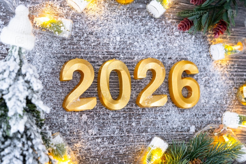 Золотые фигуры насчитывают Новый год на фоне крошечного дома с теплым светом и гирляндами. Приветственная открытка, С Новым годом, уютный дом