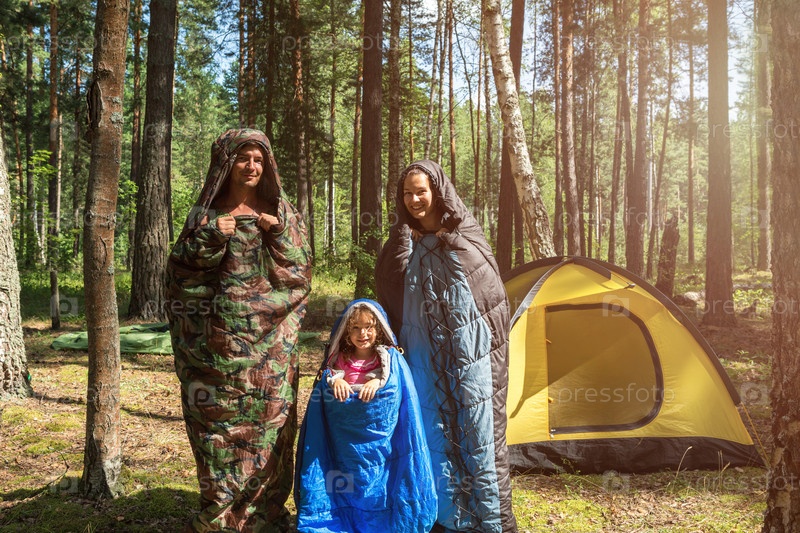 Семья туристов от отца, матери и маленькой дочери позирует в спальных мешках возле палатки. Семейный отдых на свежем воздухе, внутренний туризм, кемпинг, походное оборудование. Окукливается, как гусеницы-юмор