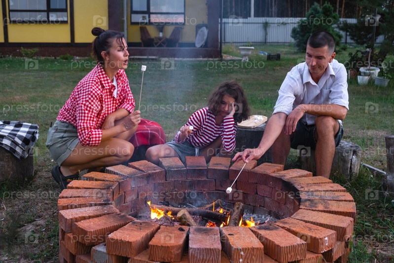 Семья мама, папа, дочь жарят зефир на шашлыках на костре в очаге во дворе дома у пожарной ямы уютным летним вечером