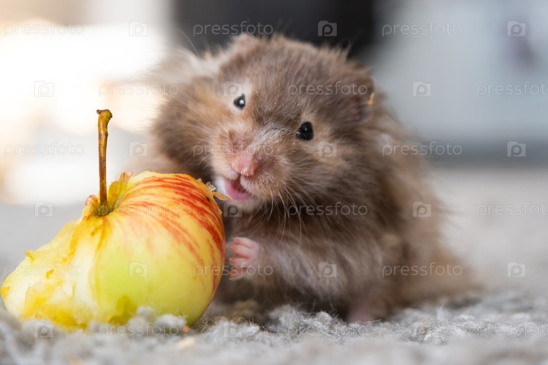 Забавный пушистый сирийский хомяк с аппетитом ест яблоко, набивает себе щеки. Питание для грызунов, витамины. Закрытие