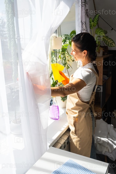 Женщина Портрет в резиновых перчатках и фартуке вручную моет окно дома тряпкой и шваброй внутри интерьера с домашними растениями. Восстановление порядка и чистоты весной, уборка сервиза