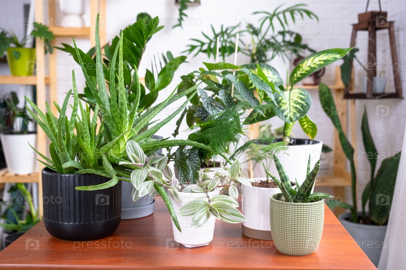 Группа популярных комнатных растений на столе в интерьере: Калатея, алоэ, диффенбахия, сансевьерия, фикус. Выращивание и уход за комнатным растением, зеленым домом, ирригация, удобрения