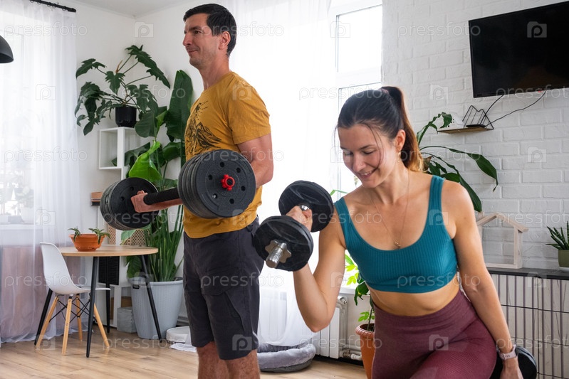 Женщина и мужчина в спортивной форме занимаются фитнесом и силовыми тренировками со штангой и гантелями дома в интерьере и котом