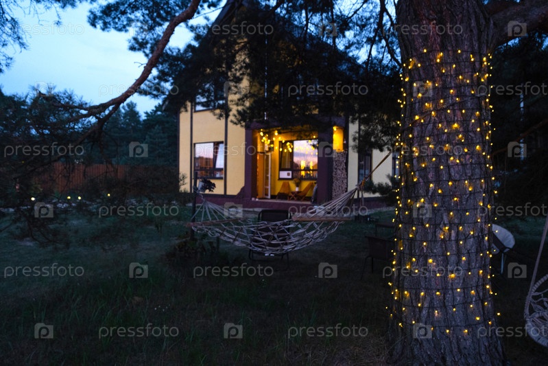 Солнечные фонари на стволе дерева в саду дома для декоративного уличного освещения и благоустройства