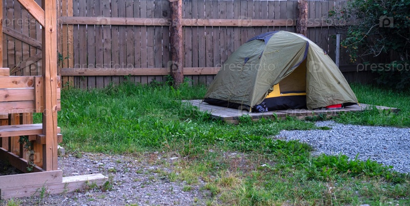 Установлена туристическая палатка в кемпинге на природе в лесу. Внутренний туризм, активные летние каникулы, семейные приключения. Экотуризм, спорт, поход. Копировать пространство, высмеивать