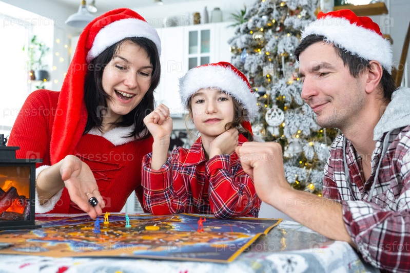 Счастливая традиционная семья папы, мамы, дочери в праздничных шляпах Санта Игра в настольную игру за столом на белой кухне с елкой и декором. Новый год, семейные ценности