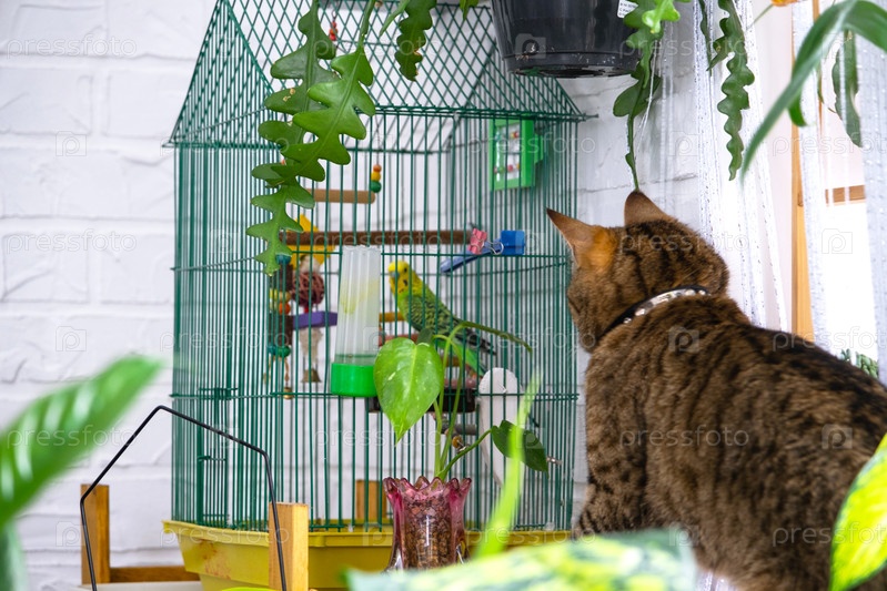 Домашняя кошка охотится на приятеля в клетке. Отношения домашних животных, кошки и попугая, опасность, стресс и дружба