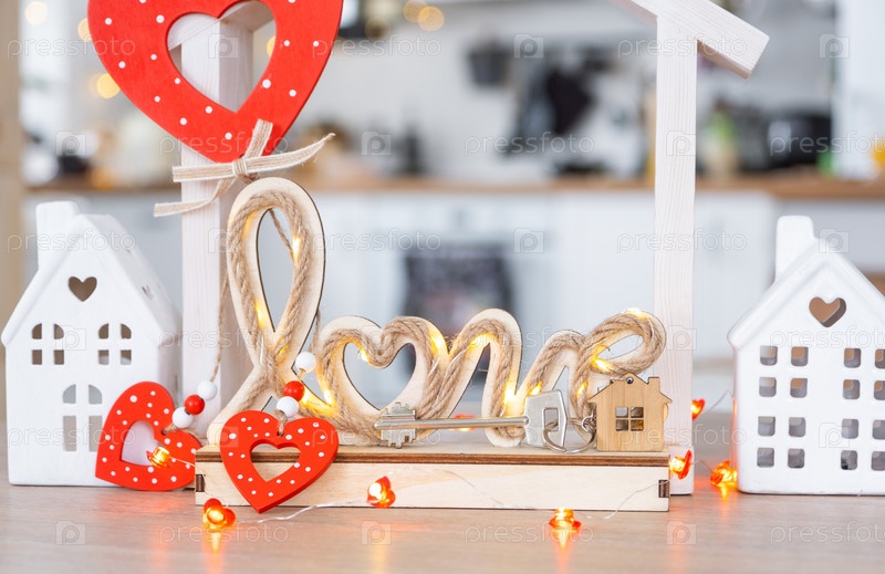Ключ к крошечному дому уютного дома с декором Валентина на столе кухни. Подарок на день валентинок, семейное гнездо любви. дизайн, проект, переезд в новый дом, ипотека, аренда и покупка недвижимости