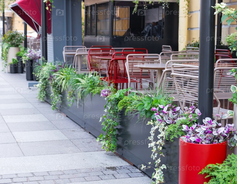 Наружное озеленение - горшки и плантаторы на городской улице с наружными цветами фиалки, маригольды, плющ. Украшение кафе, окна дома с клумбами с цветущими растениями