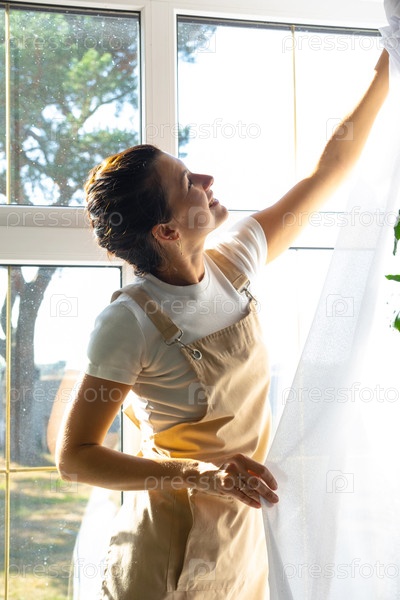 Женщина в фартуке вешает прозрачные тюльские шторы на большие окна в доме внутри интерьера с горшечными растениями. Весенняя уборка, уборка