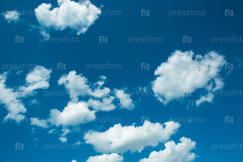 Белые кучевые облака в голубом небе. Фон с рисунком высоколучевых облаков. Погода, сезонность, экология, чистое небо. Мир