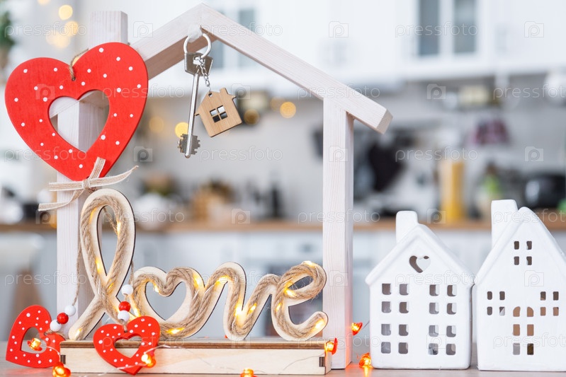 Ключ к крошечному дому уютного дома с декором Валентина на столе кухни. Подарок на день валентинок, семейное гнездо любви. дизайн, проект, переезд в новый дом, ипотека, аренда и покупка недвижимости
