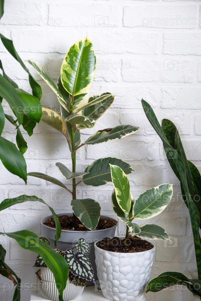 Группа популярных комнатных растений в интерьере возле белой кирпичной стены: Бегония, Сансевьерия, Фикус. Выращивание и уход за комнатным растением, зеленым домом, ирригация, удобрения