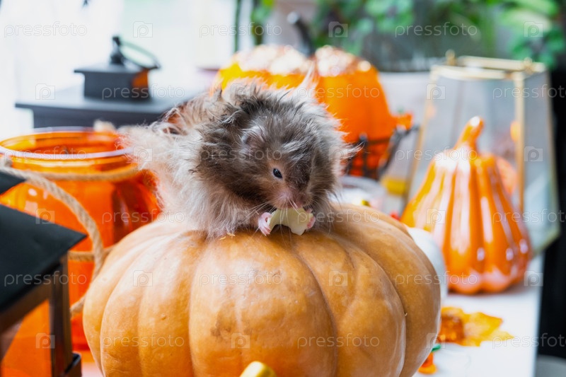 Забавный лохматый пушистый хомяк сидит на тыкве и жует лист в декоре Хэллоуина среди гирлянд, фонарей, свечей. Фестиваль урожая
