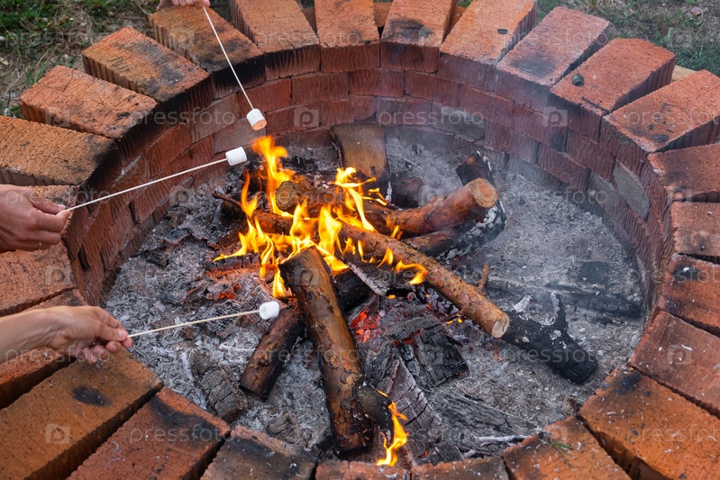 Маршаллоу на шатре жарят над костром в круглой кирпичной яме с горящей древесиной