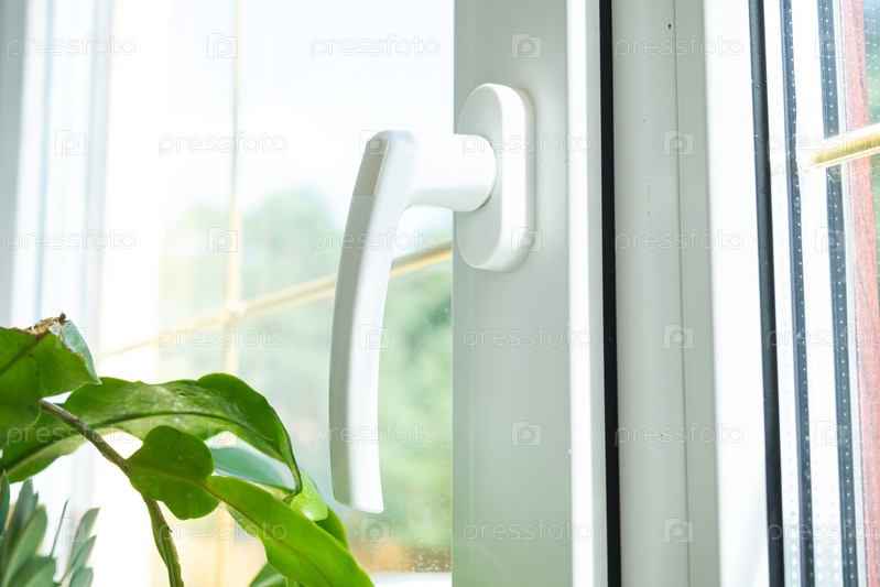 Окно изнутри дома пластиковое с двойным остеклением окна с видом снаружи на солнечный лес - салон интерьера с горшечными растениями, чистое стекло после чистки окон, закрытое окно