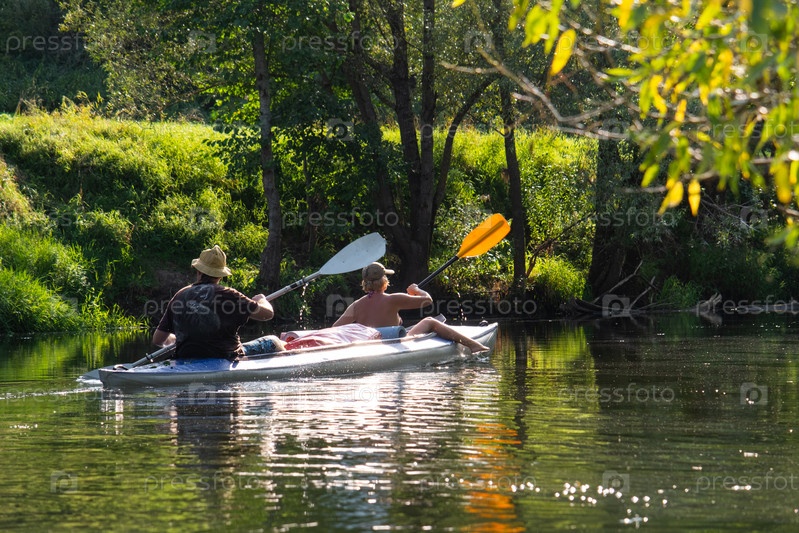 Поездка на каяке для взрослой пары на гребной лодке по реке В ярком солнечном свете поход по воде, летнее приключение