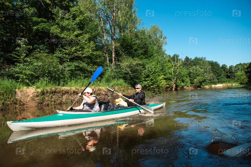 Семейная поездка на байдарках. Пожилая супружеская пара гребля на лодке по реке, поход по воде, летнее приключение. Возрастные виды спорта, умственная молодость и здоровье, туризм, активная старость