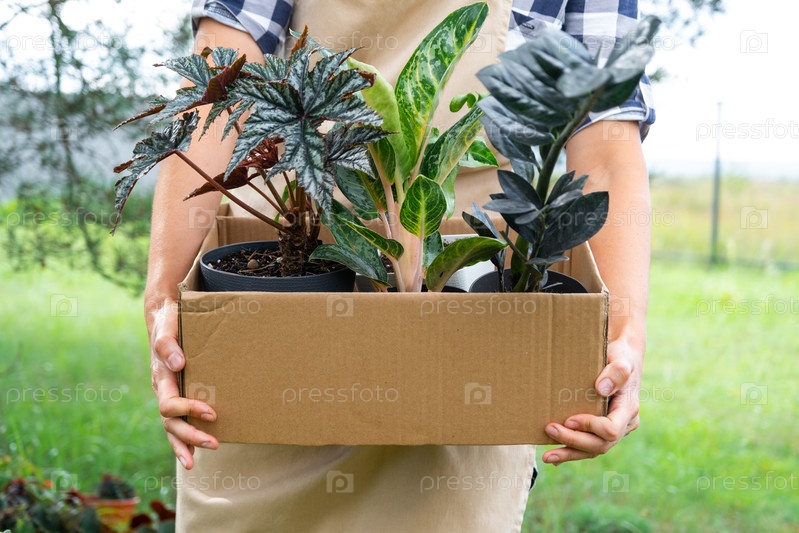 Флорист упаковывает комнатные растения в коробку для доставки покупателю. Продажа, безопасная отправка растений из магазина, посылка. Цветочный магазин, домашний малый бизнес, питомник