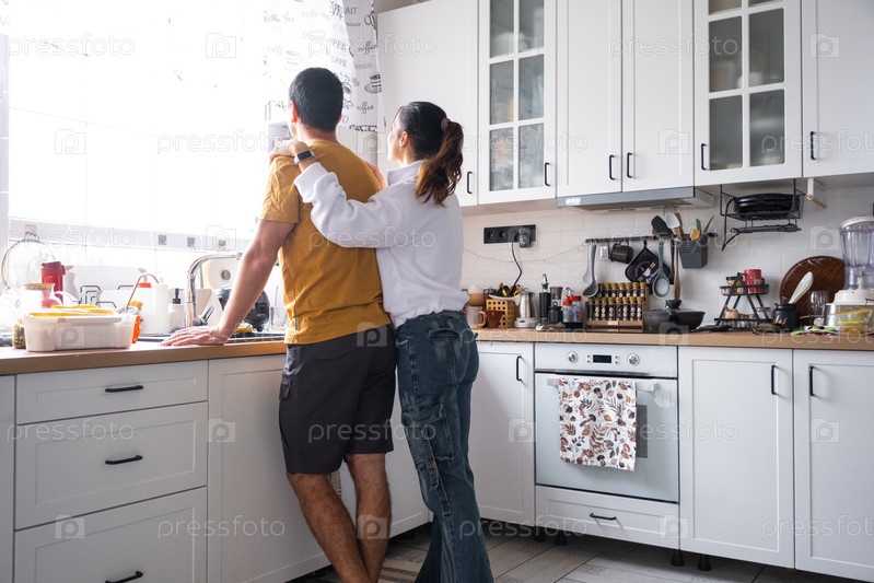 Муж и жена романтично болтают на кухне по утрам
