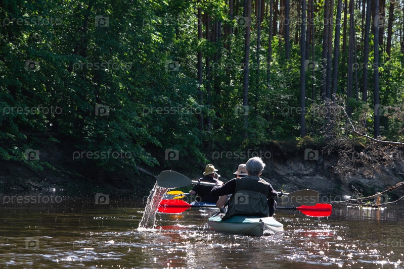 Групповая поездка на байдарках для сеньора и сеньоры. Пожилая пара и взрослая гребная лодка на реке, поход по воде, летнее приключение. Возрастные виды спорта, умственная молодость и здоровье, туризм, активная старость