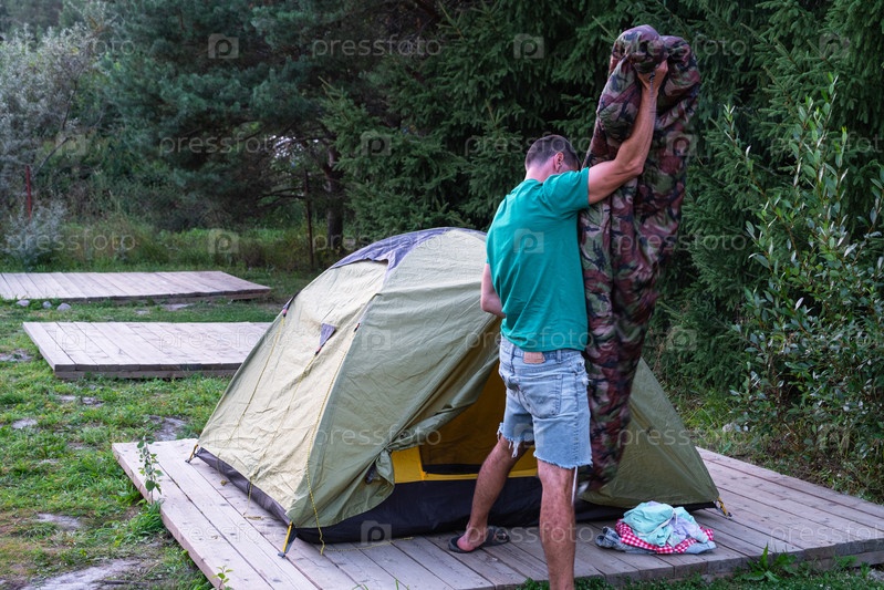 Мужчина устанавливает и собирает туристическую палатку в кемпинге на природе в лесу. Внутренний туризм, активные летние каникулы, семейные приключения. Экотуризм, спорт, поход
