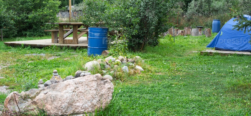 Установлена туристическая палатка в кемпинге на природе в лесу. Внутренний туризм, активные летние каникулы, семейные приключения. Экотуризм, спорт, поход. Копировать пространство, высмеивать