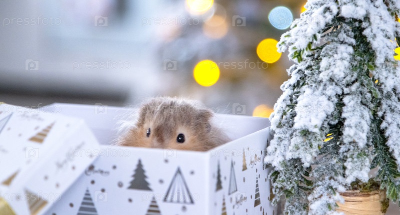 Забавный лохматый пушистый хомяк, сидящий в подарочной коробке на рождественской елке на рождественском фоне с волшебными огнями и боке
