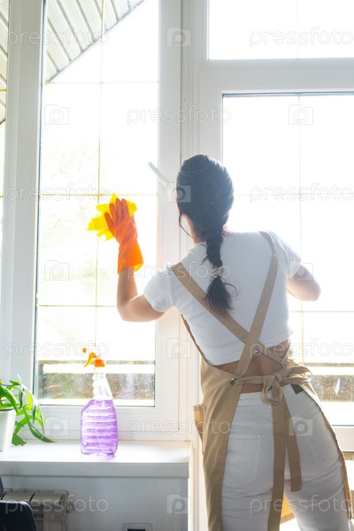 Женщина в резиновых перчатках и фартуке вручную моет оконный балкон дома тряпкой и шваброй внутри интерьера. Восстановление порядка и чистоты весной, уборка сервиза