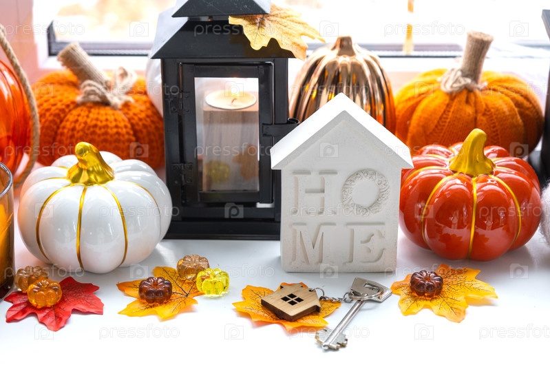 Уютный осенний декор на подоконнике с тыквами, осенними листьями, домом и ключами - осеннее настроение, Хэллоуин, жилье, переселение, ипотека, страховка