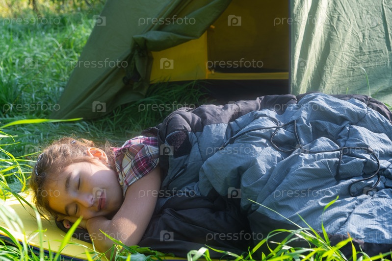 Девушка лежит в спальном мешке на теплом коврике возле палатки на открытом воздухе. Семейный кемпинг, походное снаряжение