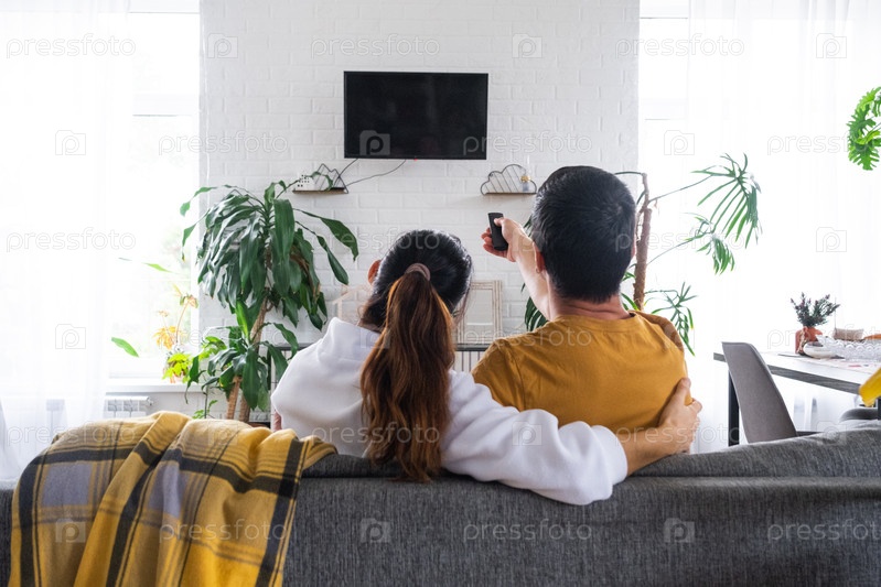 Мужчина и женщина дома в белом интерьере сидит на диване и смотрит телевизор, черный экран высмеивает. Домашний отдых, досуг, любовь, семья, дата