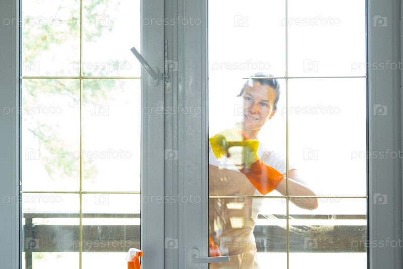 Женщина в резиновых перчатках и фартуке вручную моет оконный балкон дома тряпкой и шваброй снаружи за стеклом. Восстановление порядка и чистоты весной, уборка сервиза