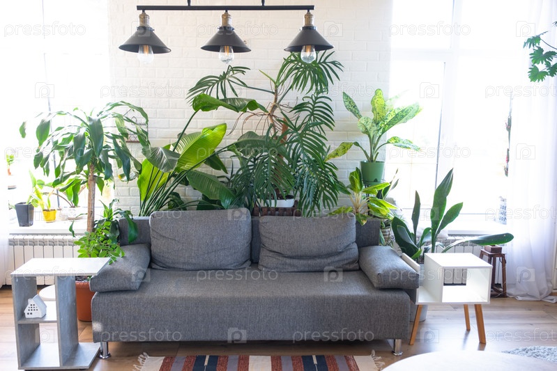 Современный интерьер дома в стиле лофт имеет большие горшечные растения, белую кирпичную стену, серый диван, полосатый ковер и большие окна