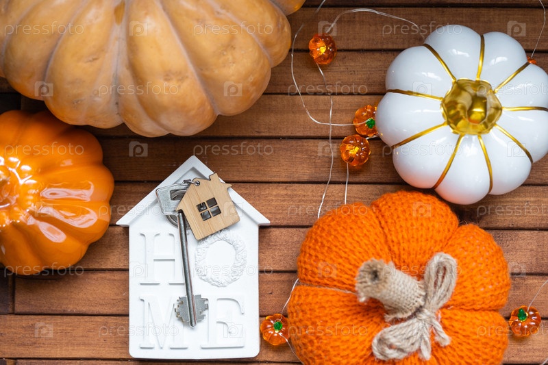 Уютная планировка на деревянном фоне планок с тыквами, осенними листьями, домом и ключами - осеннее настроение, Хэллоуин, жилье, переселение, ипотека, страхование