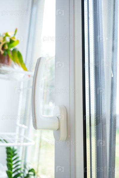 Окно изнутри дома пластиковое с двойным остеклением окна с видом снаружи на солнечный лес - салон интерьера с горшечными растениями, чистое стекло после чистки окон, закрытое окно
