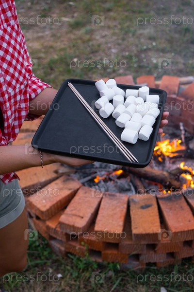 Маршмаллоу на подносе жарить на костре на круглом кирпичном костре во дворе дома