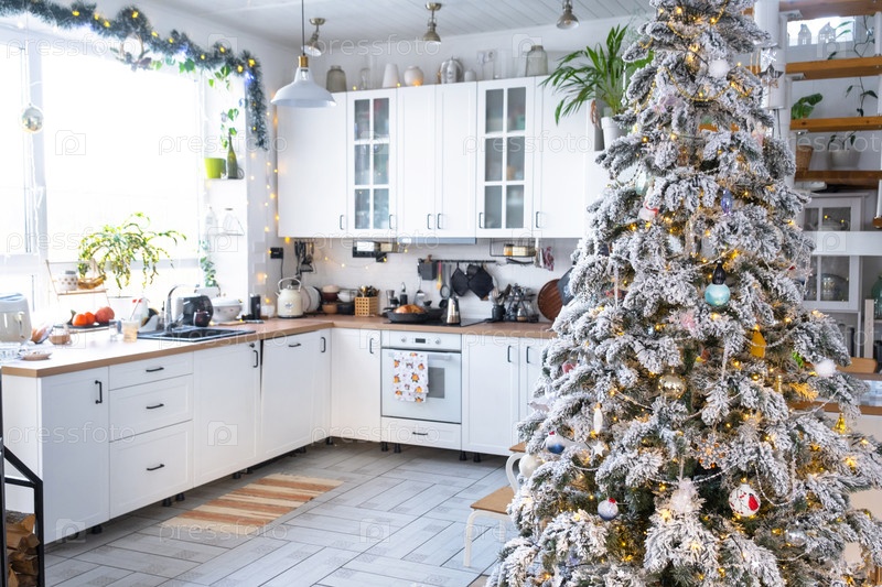 Рождественский декор в белой кухне, современный деревенский интерьер со снежной елкой и золотыми сказочными огнями. Новый год, рождественское настроение, уютный дом