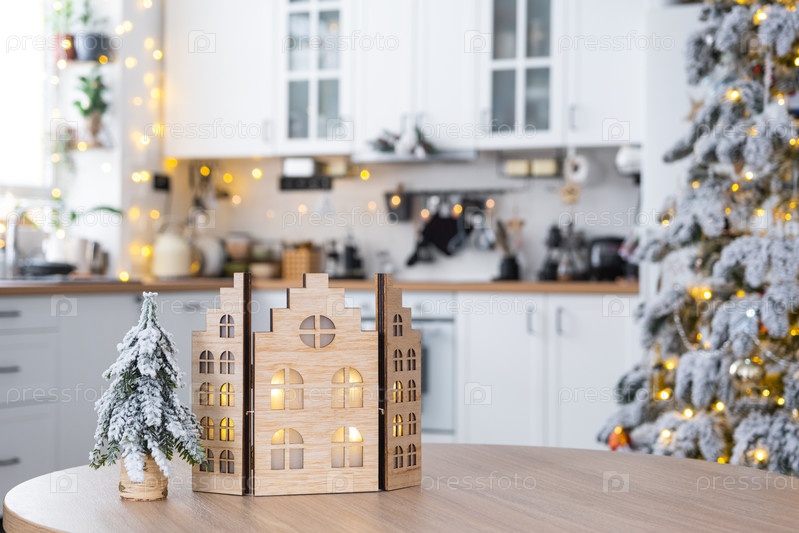 Уютный рождественский декор крошечного дома небольшого размера на столе праздничной белой современной кухни. Подарок на Новый год. Страхование, переезд в новый дом, ипотека, аренда и покупка недвижимости